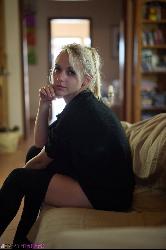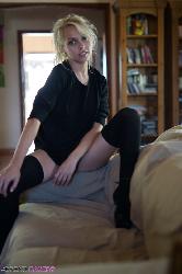 Alluring hottie in black knee-highs spreading her long legs in Breathtakers set Little Black Sweater