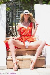 Bombastic blonde showing off her panties under sexy red dress in Breathtakers set Garden Party