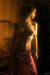 Busty brunette hottie posing topless wrapped up in a scarf in Met Art set Feminae