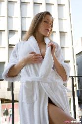 Charming model passionately and slowly unties her bathrobe uncovering gorgeous breasts on the bed in Teen Dreams set Elisa Naked In Bed
