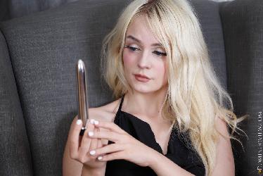 Coroline lifts her legs on a sofa and widely spreads them for an adventure with her new sex toy in Domingo View set Metal Dildo