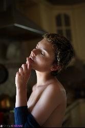 Dainty short-haired sweetie posing naked in the kitchen in Breathtakers set Boyfriend Jeans