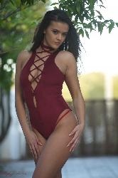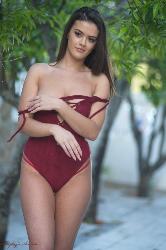 Delicate brunette cutie taking off her skin tight swimming suit in Hayleys Secrets set Ravishing Rouge BTS