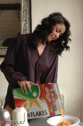 Delicate brunette sweetie eating her light breakfast topless in Girlfolio set Wake Up