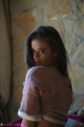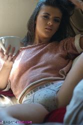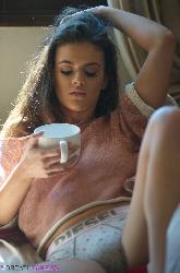 Delicious brunette stripping after taking her morning coffee in Breathtakers set Cafe Creme