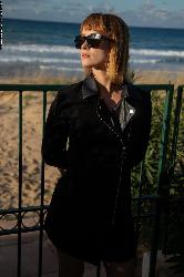 Foxy beauty April takes off her black coat and exposes her lovely breasts with stiff nipples and peachy ass accentuated by sexy thongs in Photodromm set The Last Sun