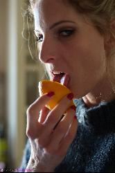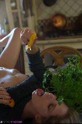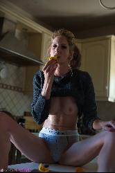 Playful blonde makes a mess out of herself in the kitchen in Breathtakers set Freshly Squeezed