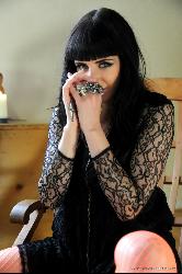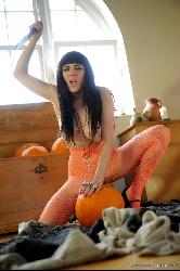 Playful dark-haired goth girl carving a pumpkin naked in Breathtakers set Pumpkins