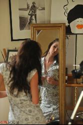 Raven-haired beauty cupping her enhanced boobs and a tiny waist in Girlfolio set The Loft
