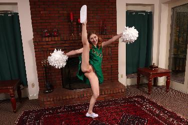 Redhead bombshell with pigtails Scarlet Skies takes off her cheerleader clothes and eases top of the fire iron inside her dripping wet snatch in Als Scan set Fiery Kegels