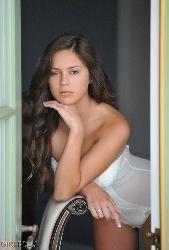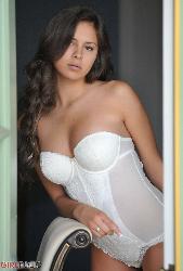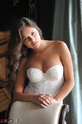 Romantic corset barely containing large breasts of a pretty brunette in Girlfolio set Cover Story