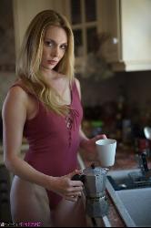 Seductive blonde Anuska making her coffee naked in the kitchen in Breathtakers set Coffee Culture