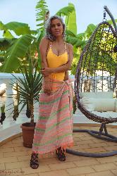 Tanned cleavage of a siren emphasized by an orange swimsuit in Hayleys Secrets set Tropic Tan