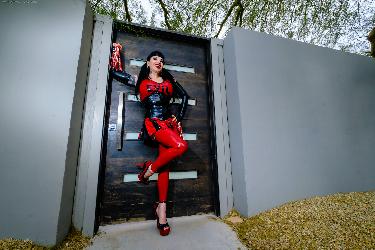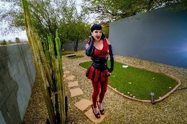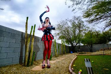 Tattooed mistress Maya Sinstress displays her huge melons and butt while posing as a latex wearing cheerleader in Crazy Babe set Devilish Cheerleader