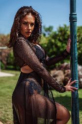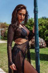 Tempting brunette seductress making heads turn in her sheer black dress in Hayleys Secrets set Leaning On A Lamp Post
