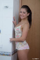 Young brunette shows off her fit and flawless physique with a cheerful smile on her pretty face in the bathroom in Teen Dreams set Bathroom Sex