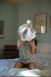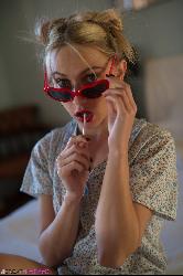 adolescent à face fraîche léchant une sucette tout en retirant lentement sa culotte dans des époustoures set Lolita