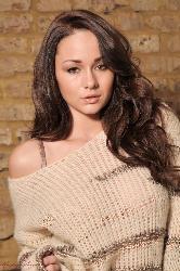 Beauté brune encrée posant dans de minuscules strings de couleur nue dans les secrets de Hayleys sur votre canapé
