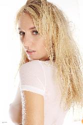 Blonde mignon aux yeux bleus montrant ses seins en chemise de Hayleys Secrets Set humide et sauvage