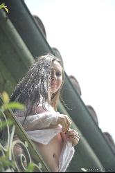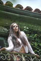 Brunette curvacée chérie caressant son castor rasé sur le canapé dans les époustoures set balcon