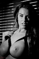 Brunette voluptueuse Sweettie Réglage de ses énormes seins Gratuit à Hayleys Secrets Situé en noir et blanc