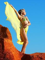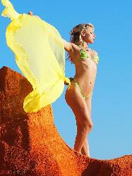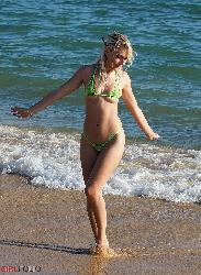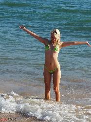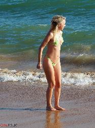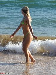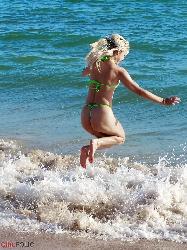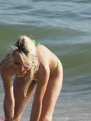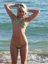 Chlone blonde à la poitrine à la poitrine à la poitrine montrant sa figure à la plage de Girlfolio Set Itationy Bitsy Teeny Weeny Bikini