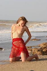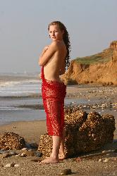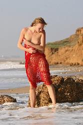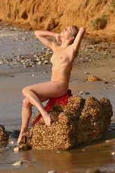 La déesse de la plage placant une écharpe rouge sur ses genoux divins dans Met Art Set Placer Placer