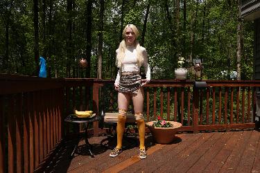 La poupée blonde skinny enlève ses vêtements et se masturbe avec la banane et le concombre dans la balayage ALS SCAN SET TOP TOP TOPT ET CROPS