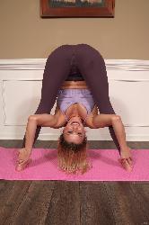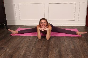 Le jeune modèle blonde montre son corps super flexible alors qu'elle élimine lentement ses vêtements de gymnase sur le tapis de yoga dans le jeu de balayage de la SLA