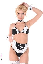 Le modèle blonagé sale d'esprit élimine son costume de femme de ménage et clignote de manière séduisante de ses seins avantageux et de la vulve super lisse sur le sol de Istripper, pas de mots sales