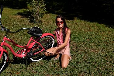 Modèle exquis Freya Von Doom raconte la poignée du vélo avant la poussée des touches de mécanicien dans son arrachage rosé humide à l'extérieur dans la prise de socket de balayage ALS