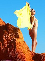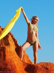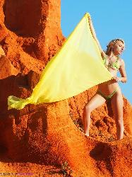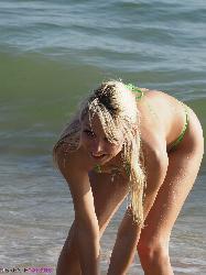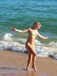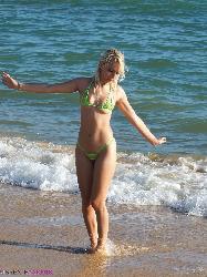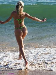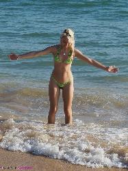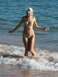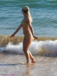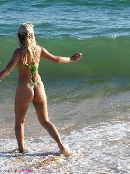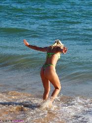 Sirène angélique dans un minuscule bikini en cours d'exécution sur une plage dans des époustoures Set Sets Beach Scape