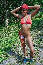 Slim Latina modèle bandes son bikini rouge sexy à l'extérieur et expose sa chatte de papillon sucré et ses belles seins avec des mamelons brunâtres dans la montre 4 beauté set jungle trésor