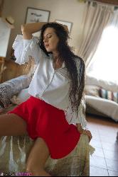 Sweet Brunette Niky a l'air délicieux dans une jupe rouge vif dans les soufflets à couper les soufflets de Niki