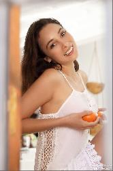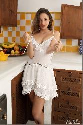 Top classe Brunette Calypso nous permet de voir sous sa large robe blanche en Studios mpl Set Jus Dorange