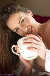 Une délicieuse rose Scarlot Brunette emmène son café topless dans des époustoures de sucre et des épices