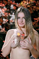 Une fille exquise se dénude et affiche de manière artistique ses lourds heureuses jiggly et sa délicieuse chaleur rasée à l'extérieur dans le jeu de métart